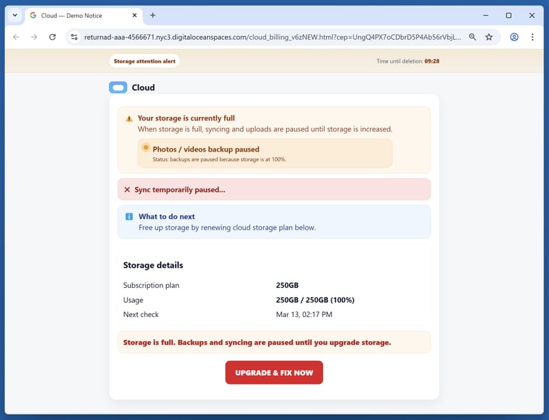 Nuestro equipo ha revisado el correo electrónico y ha descubierto que está disfrazado de notificación relativa al plan de almacenamiento en la nube del destinatario. Insta al destinatario a resolver el «problema» a través del enlace proporcionado lo antes posible. El enlace incluido conduce a sitios web engañosos. Este correo electrónico fraudulento debe ignorarse y eliminarse si se recibe.